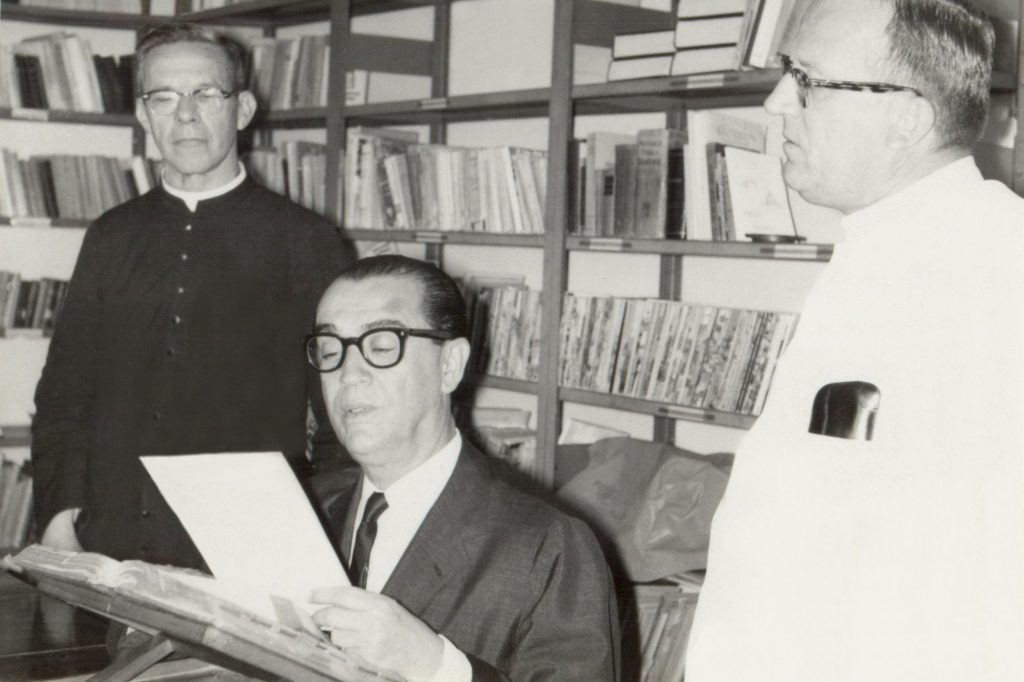 In the photo, Juscelino Kubitschek (center) is next to Father Alfredo Elfrink, SSCC, (right), first Vice-Postulator of the Cause, writing his testimony for the beatification process that had just begun in mid-1956.