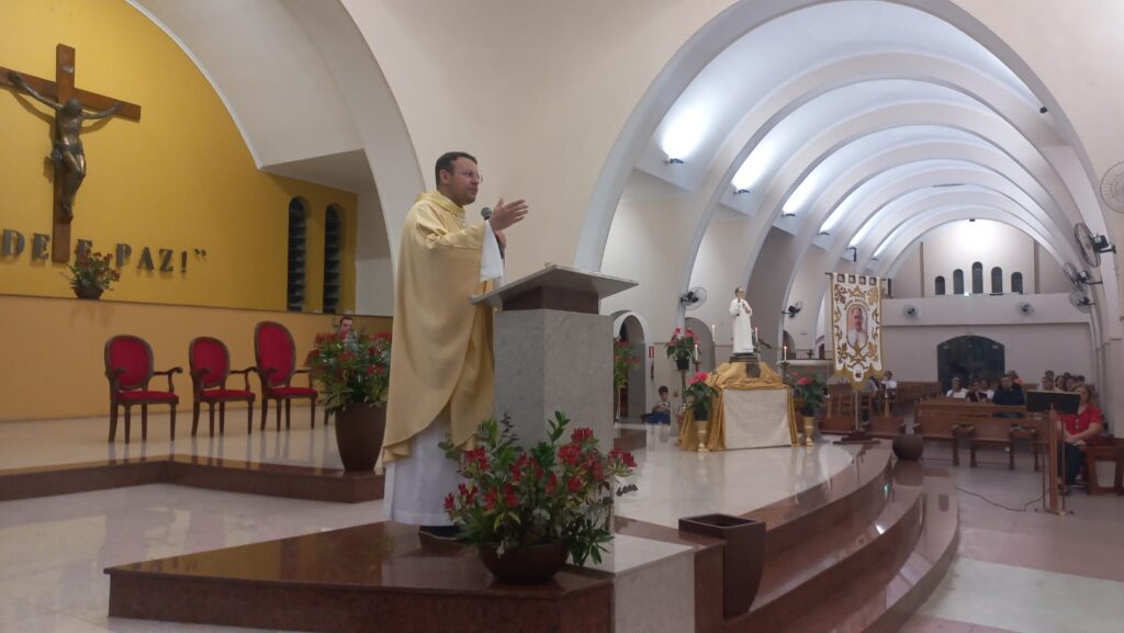 Around 6 PM, devotees were already gathering at the Sanctuary for the recitation of the Holy Rosary, praying for the Canonization of Blessed Father Eustace. Then, at the Eucharistic celebration at 7 PM, Father Júnio presided over the ceremony, which included the special participation of members of the Men's Rosary, Women's Rosary, and Divine Mercy Rosary groups—groups that meet weekly at the Sanctuary of Health and Peace.