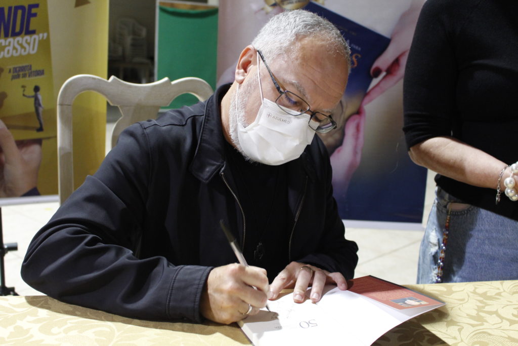 After Holy Mass, the missionary went to the Community Center where he met with everyone individually, dedicating his books and taking photos with all who passed by. Father Luís also recorded material for the Father Eustáquio Store, highlighting his works.