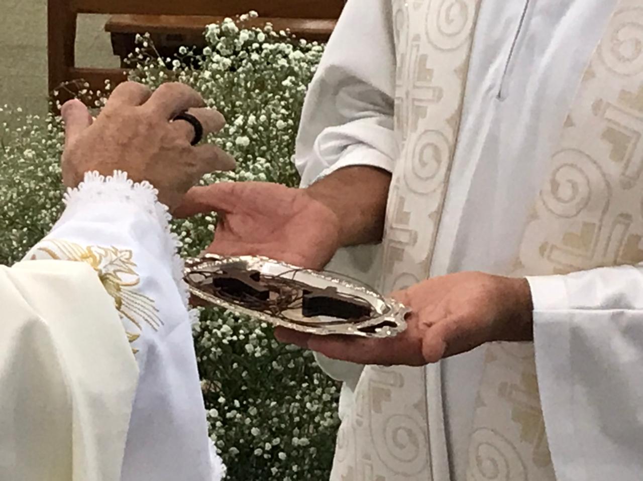 Around 11:00 AM, the provincial superior, Father Osvânio Mariano, ss.cc, began the rite of entry for the new candidates to live religious life. The young men introduced themselves and shared how they learned about the institution. Father Osvânio then welcomed them with words of encouragement and vocational inspiration. Finally, Antônio Carlos and Douglas received a cross, a symbol of the Sacred Hearts and of their entry into the Postulancy of the Congregation.