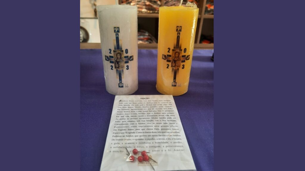 The Family Paschal Candle has arrived at Padre Eustáquio's store. The price is R$19. The candle is available in two colors: white and yellow. All models come with a prayer leaflet to be used with the family. In addition, the candle comes with mini cloves to be placed during the prayer.