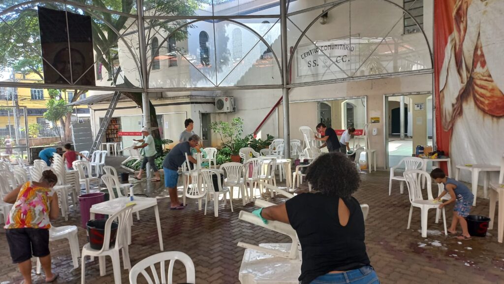 Many people who were unable to carry benches or scrub the floor went to the Sanctuary to offer a snack to those who had been working. In the evening, the church received hundreds of people for the Easter Vigil Celebration and the Easter Fellowship, promoted by the parish at the Community Center.