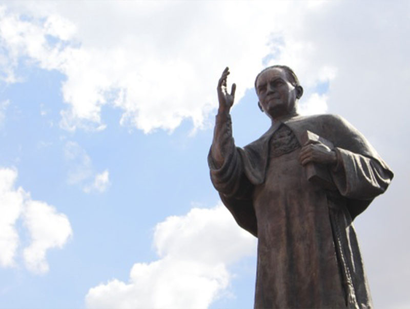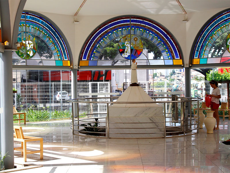 Ao centro, onde repousam os restos mortais de Padre Eustáquio, uma grande pedra bruta simboliza a vida humana, que lapidada pode alcançar a santidade. Esta lapidação é representada por uma pirâmide de sete faces, cada uma representada por um Dom do Espírito Santo: Sabedoria, Entendimento, Conselho, Fortaleza, Ciência, Piedade e Temor a Deus. Na ponta da pirâmide, está uma imagem de Padre Eustáquio, símbolo desta santidade.