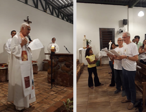 Na foto: à esquerda, Padre Geraldo e, à direita, Will van den Boomen, sobrinho de Padre Eustáquio, ao lado do intérprete e junto da comunidade, participando da celebração.